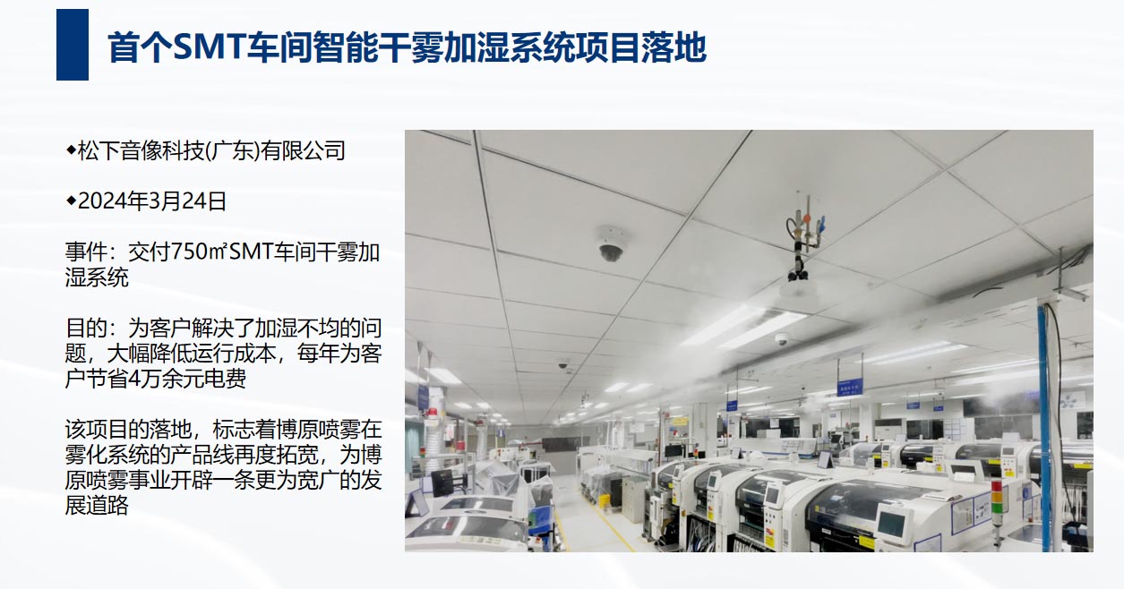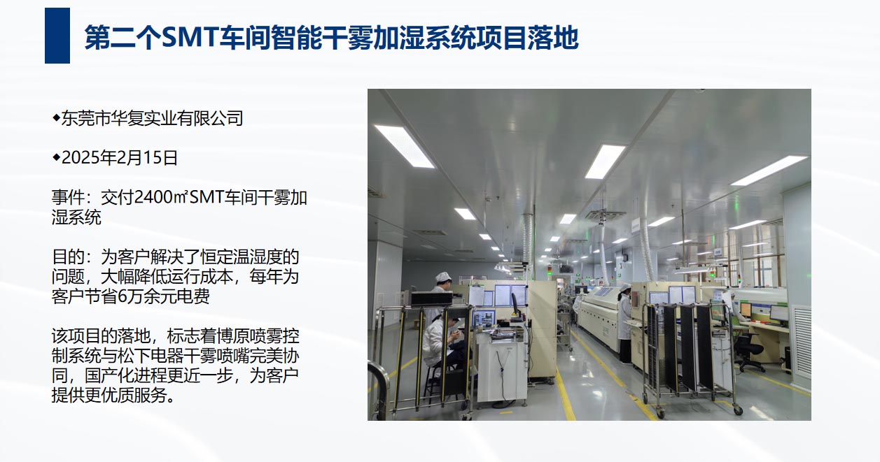 雙方于2023年簽訂MOU戰(zhàn)略合作協(xié)議,目前水霧項目穩(wěn)定有序的開展,兩個SMT車間智能加濕項目完美落地,噴霧控制系統(tǒng)已實現(xiàn)國產(chǎn)化,后續(xù)雙方會持續(xù)優(yōu)化產(chǎn)品及項目流程,為用戶提供更優(yōu)質的服務。