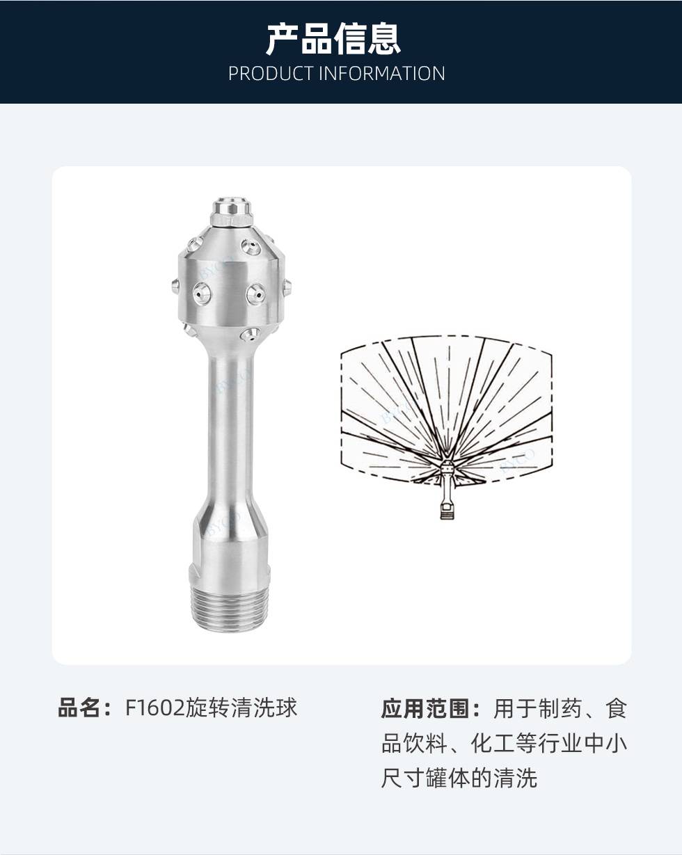 特點:固定式,用戶直徑達(dá)1.6米的槽罐,噴嘴固定,清洗或漂洗小容器的效果理想,多孔噴射,噴射的覆蓋面和形狀有多種選擇。耐用、抗腐蝕設(shè)計。