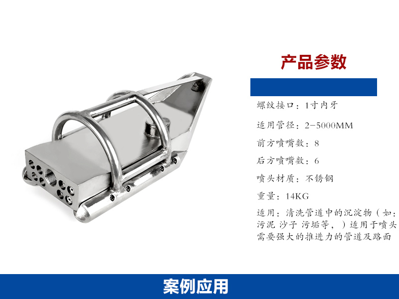 螺紋接口:1寸內(nèi)牙,或者訂做噴嘴接口尺寸,重量14KG,適用管徑或路面:2-5000MM,主要適用于清洗管道中的沉淀物(如:污泥 沙子 污垢等,)適用于噴頭需要強(qiáng)大的推進(jìn)力的管道及路面,噴頭材質(zhì)為不銹鋼材質(zhì),噴嘴可更換。